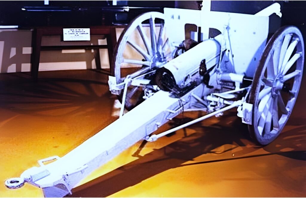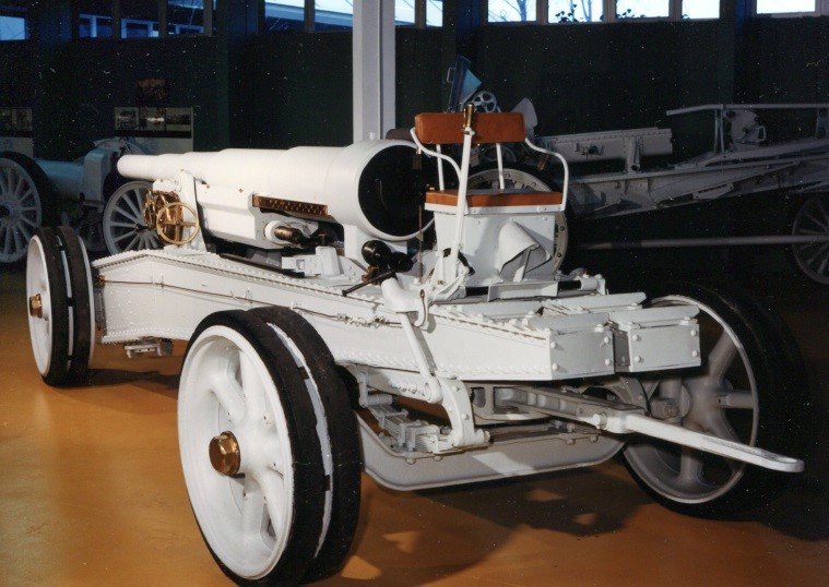 un canon de 75 mm modèle 1897 : premier canon à lien élastique (seul le tube recule au départ du coup), tube en acier de 33 calibres (2,475 m), portée max 6 500 m, cadence de tir 20 à 28 coups par minute