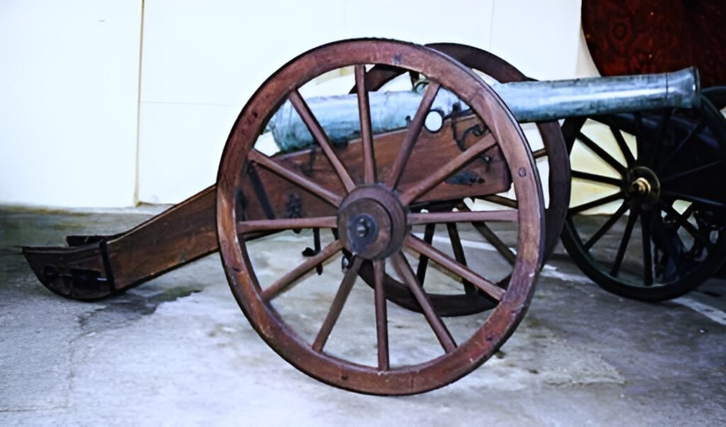 Un canon de campagne de 8 livres système Vallière (1732) : canon en bronze de 18 calibres (1,90 m) sur affût en bois, portée 800 à 1 500 m, cadence 1 coup par minute avec boulet plein de 8 livres (Ø 106 mm) ensaboté.
