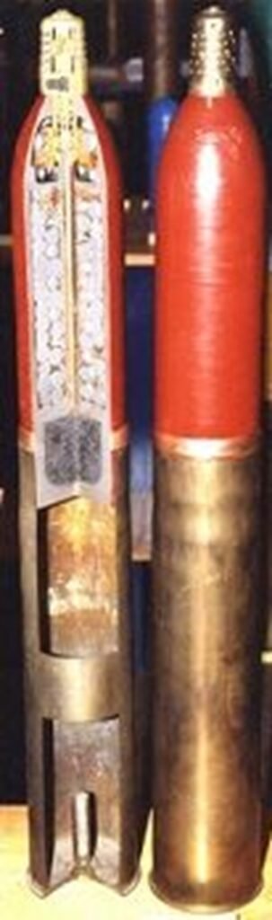 les cartouches pour canon de 75/97 (obus de 5 à 7 kg et sa douille contenant une charge propulsive réglable)