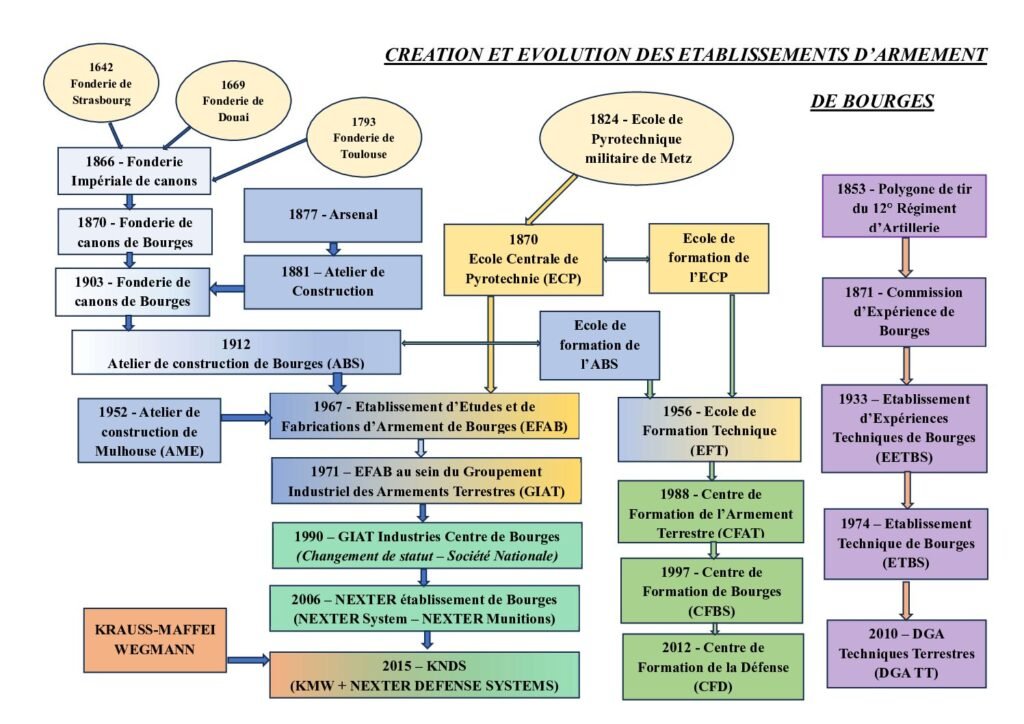 En 1967 trois établissements, l’Atelier de Construction de Bourges (l’ancienne fonderie), l’Ecole centrale de Pyrotechnie et l’Atelier de construction de Mulhouse sont regroupés et prennent le nom d’Etablissement d’Etudes et de Fabrications d’Armement de Bourges (EFAB) qui deviendra successivement Centre de Bourges de GIAT Industries en 1990, et Nexter établissement de Bourges en 2006.